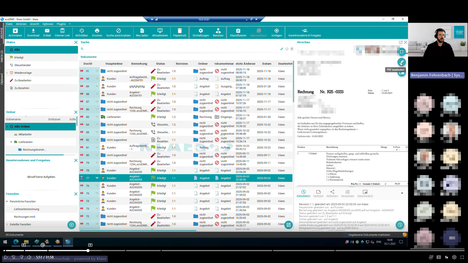 Er führte live durch die wichtigsten Funktionen: Jedes Dokument erhält eine eindeutige ID, wird revisionssicher gespeichert und bei Änderungen automatisch versioniert. „So bleibt alles nachvollziehbar – ganz ohne Papierordner“, betonte er. Markierungen, Notizen und Stempel wie „geprüft“ lassen sich direkt setzen, dazu kommen individuelle Status und eine frei gestaltbare Ordnerstruktur.